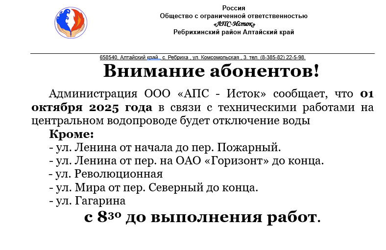 Администрация ООО «АПС - Исток» сообщает, что 01 октября 2025 года в связи с техническими работами на центральном водопроводе будет отключение воды...